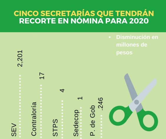 En una revisión hecha por AVC Noticias al presupuesto 2020 y 2019, se encontró que las secretarias que tendrán más recorte en su nómina, son la Secretaría de Educación de Veracruz (SEV) con una disminución de 2 mil 201 millón de pesos.