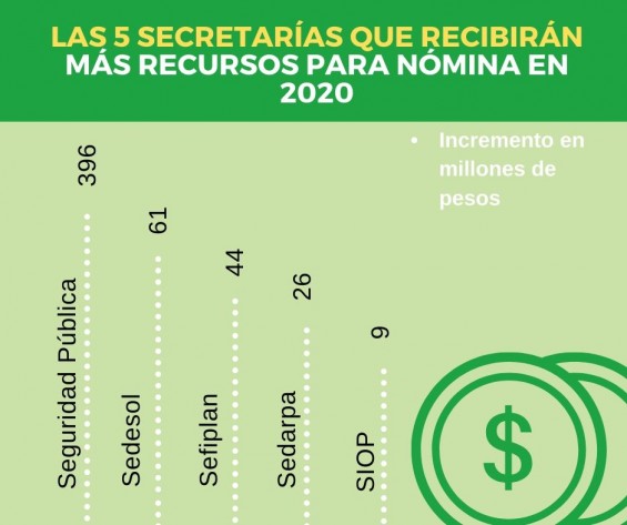 En contraste, otras 10 tendrán aumento, la más beneficiada será la Secretaría de Seguridad Pública con un aumento de 396 millones de pesos para gasto para salarios y prestaciones a su plantilla en comparativa con el ejercicio anterior 2019.