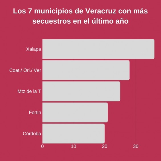 La misma organización advierte que en la entidad Veracruzana, los cinco municipios con mayor incidencia en secuestro en el último año, son: Xalapa (36), Coatzacoalcos, Orizaba, Veracruz-puerto, Martínez de la Torre, Fortín de las Flores, y Córdoba.