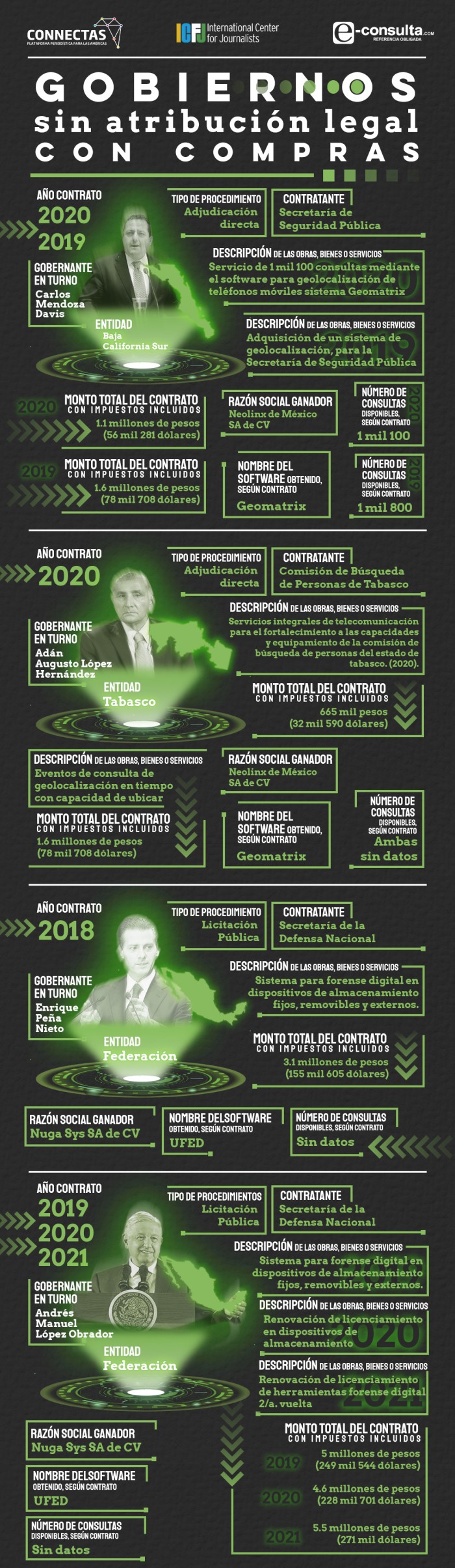 Los gobiernos adquirieron, principalmente, el sistema Geomatrix con la empresa Neolinx de México SA de CV, especializado en intervenir geolocalizaciones, con una inversión nacional superior a los 147 millones de pesos (7.3 millones de dólares). También compraron diversas licencias de UFED, un programa que sirve para extraer datos de dispositivos móviles y localizar información de ciudadanos en Internet, con un pago total de 34.2 millones de pesos (1.7 millones de dólares).