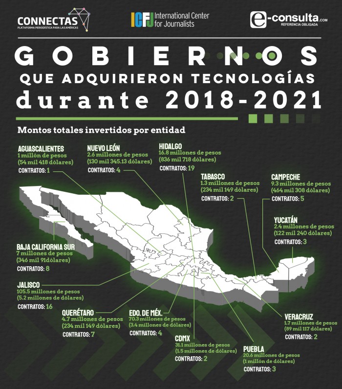 Los gobiernos estatales son los principales clientes de artefactos de vigilancia a ciudadanos a nivel nacional y también los que menor información pública poseen. El gobierno de Jalisco, encabezado por Enrique Alfaro Ramírez, negó en un principio poseer tecnologías de intervención, pero es unos los principales compradores en el país con 105.5 millones de pesos (5.2 millones de dólares) destinados a monitoreos de geolocalizaciones y extracciones de datos de dispositivos. La mayoría de esos contratos no aparece en el portal de transparencia.